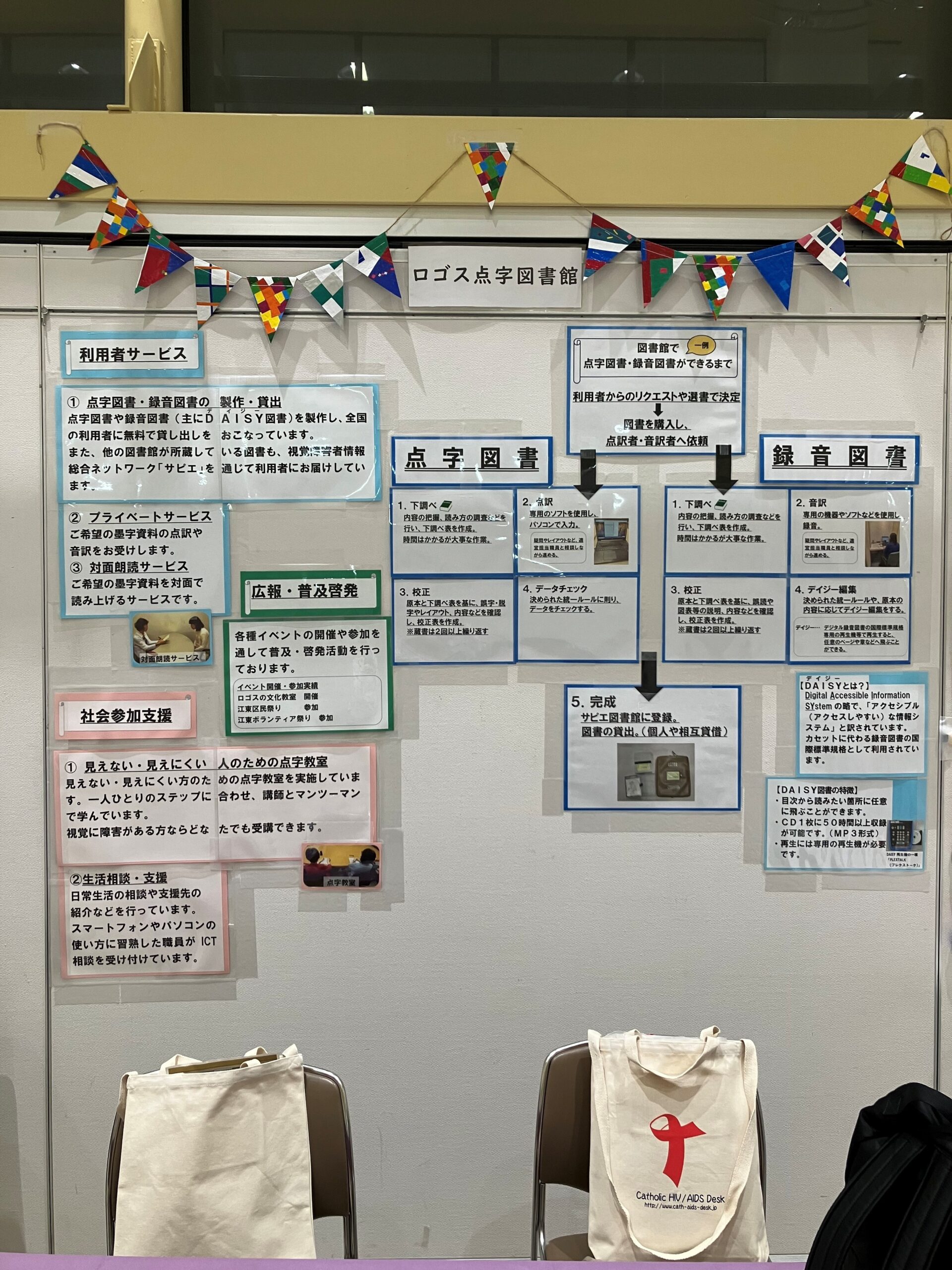 ロゴスは2回目の出展でしたが、当館で活動してくださっている音訳ボランティアグループの方々、点訳ボランティアグループの方々も出展しており、一緒にボランティアまつりを盛り上げることができました。また、今年は隣のブースに出展されていたハッピー・ハンド様に手作りのバナー飾りをいただき、ブースをにぎやかに飾ることができました。